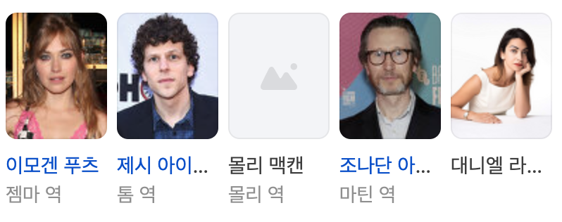 - 출연: 이모겐 푸츠, 제시 아이젠 버그, 몰리 맥캔, 조나단 아리스 등